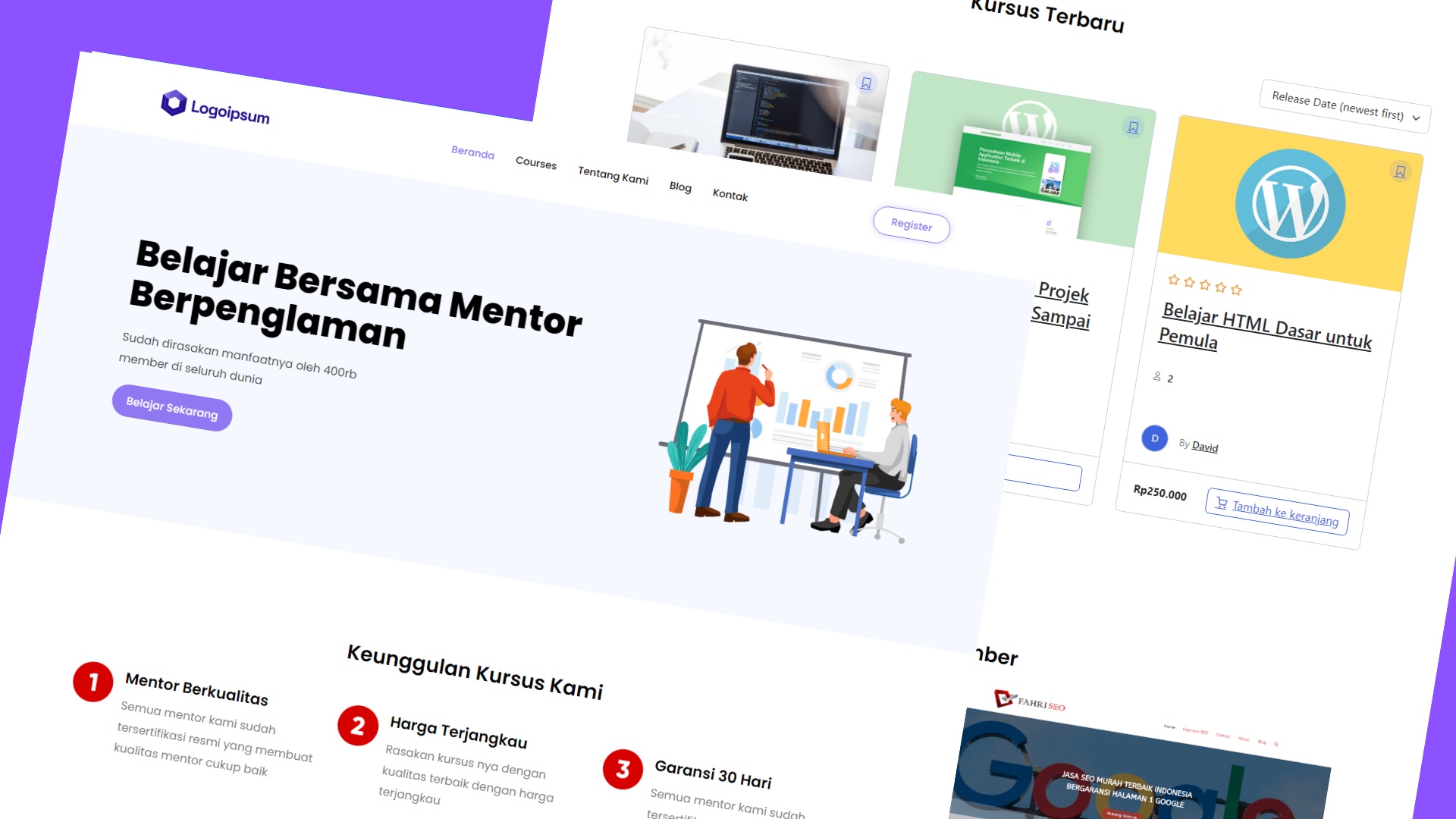Dalam kelas ini kamu akan belajar dengan full praktek membuat 15 projek website profesional yang dibuat khusus untuk pemula.